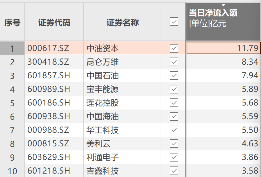 上证报中国证券网讯(记者 徐蔚)Choice数据显示,3月19日,资金净流入额排名前十的个股依次是中油资本、昆仑万维、中国石油、宝丰能源、莲花控股、中国海油、华工科技、美利云、利通电子、吉鑫科技。其中,中油资本获净流入11.79亿元。