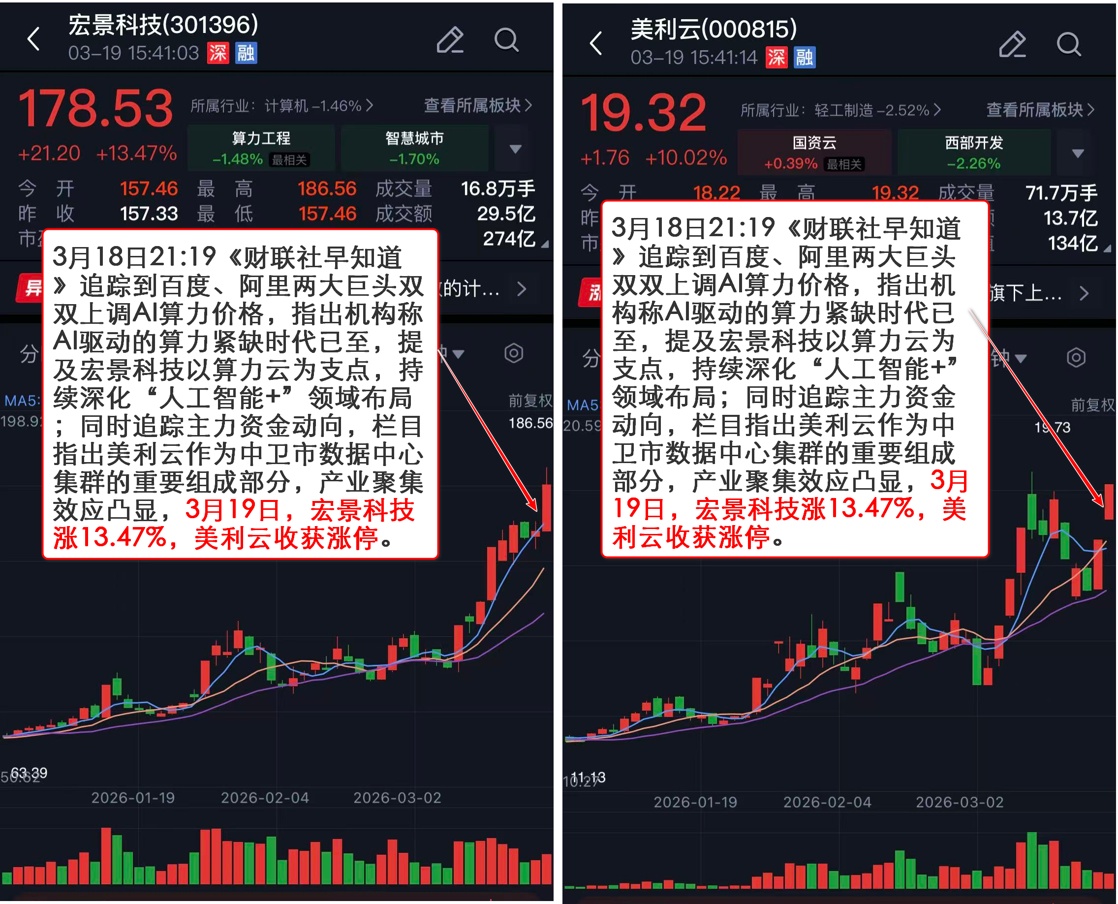 3月18日21:19《财联社早知道》追踪到百度、阿里两大巨头双双上调AI算力价格,指出机构称AI驱动的算力紧缺时代已至,提及宏景科技以算力云为支点,持续深化“人工智能+”领域布局;同时追踪主力资金动向,栏目指出美利云作为中卫市数据中心集群的重要组成部分,产业聚集效应凸显,3月19日,宏景科技涨13.47%,美利云收获涨停。