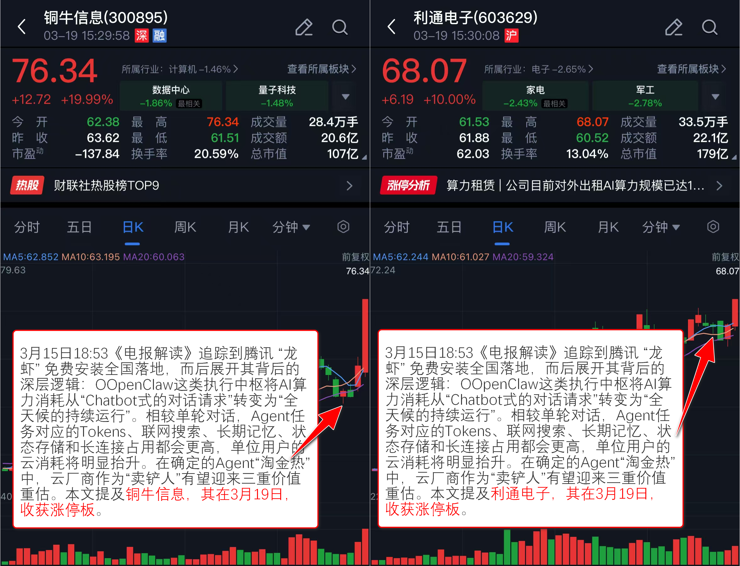 3月15日18:53《电报解读》追踪到腾讯 “龙虾” 免费安装全国落地,而后展开其背后的深层逻辑:OOpenClaw这类执行中枢将AI算力消耗从“Chatbot式的对话请求”转变为“全天候的持续运行”。相较单轮对话,Agent任务对应的Tokens、联网搜索、长期记忆、状态存储和长连接占用都会更高,单位用户的云消耗将明显抬升。在确定的Agent“淘金热”中,云厂商作为“卖铲人”有望迎来三重价值重估。本文提及利通电子、铜牛信息,其在3月19日,纷纷收获涨停板。