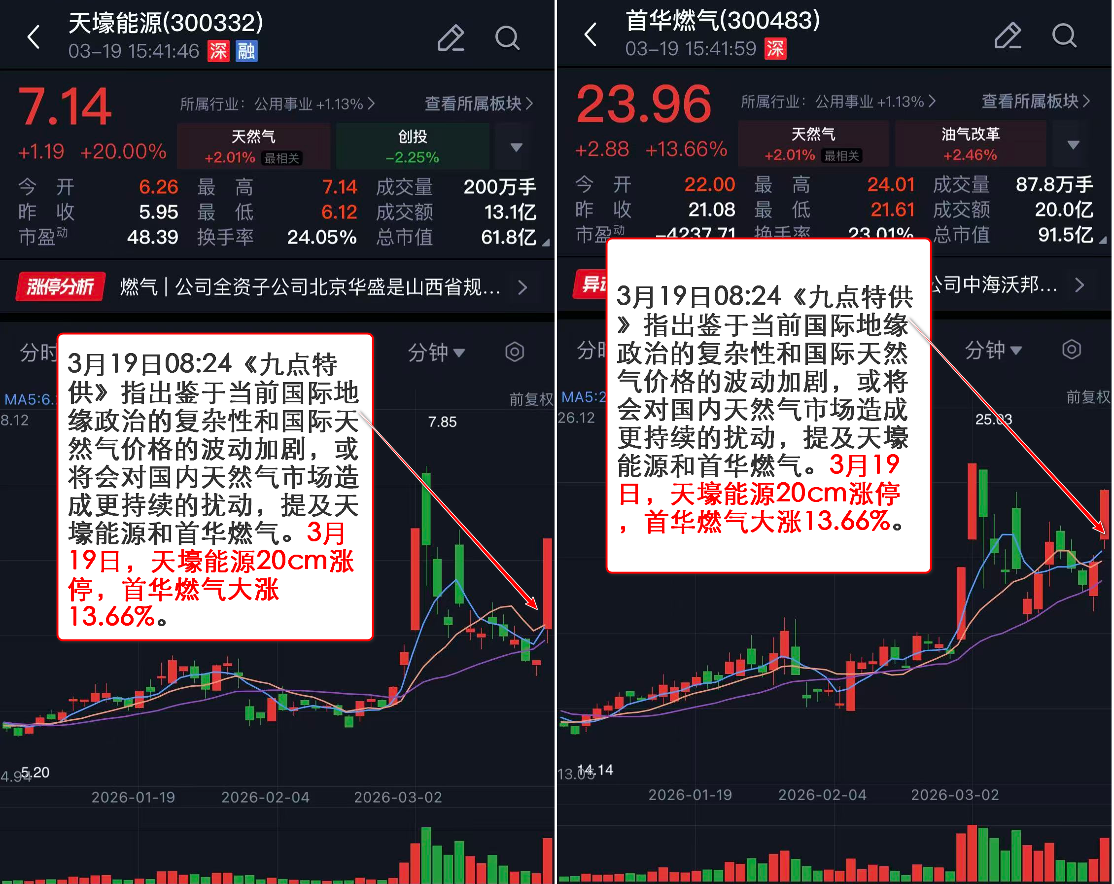 3月19日08:24《九点特供》指出鉴于当前国际地缘政治的复杂性和国际天然气价格的波动加剧,或将会对国内天然气市场造成更持续的扰动,提及天壕能源和首华燃气。3月19日,天壕能源20cm涨停,首华燃气大涨13.66%。