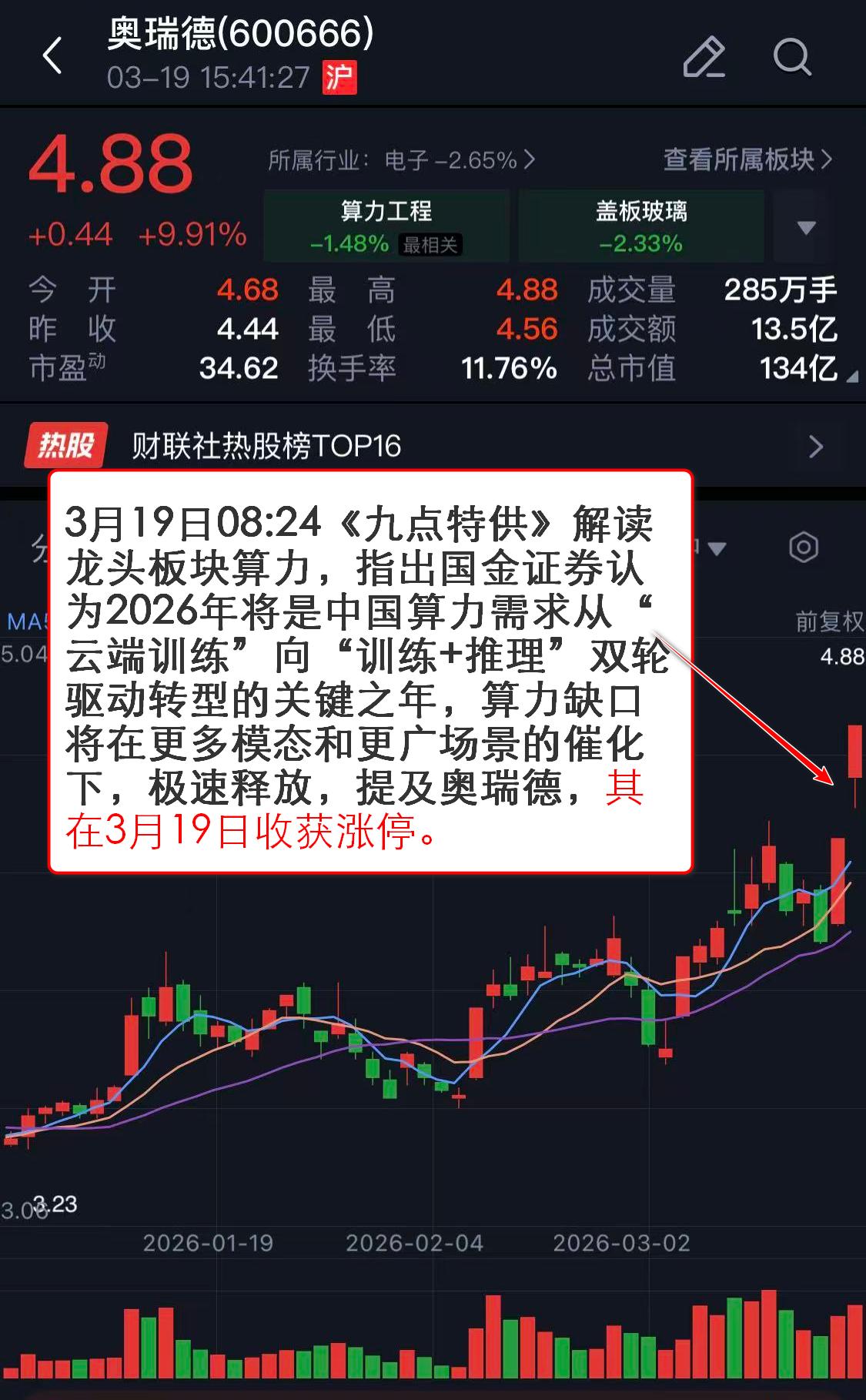 3月19日08:24《九点特供》解读龙头板块算力,指出国金证券认为2026年将是中国算力需求从“云端训练”向“训练+推理”双轮驱动转型的关键之年,算力缺口将在更多模态和更广场景的催化下,极速释放,提及奥瑞德,其在3月19日收获涨停。