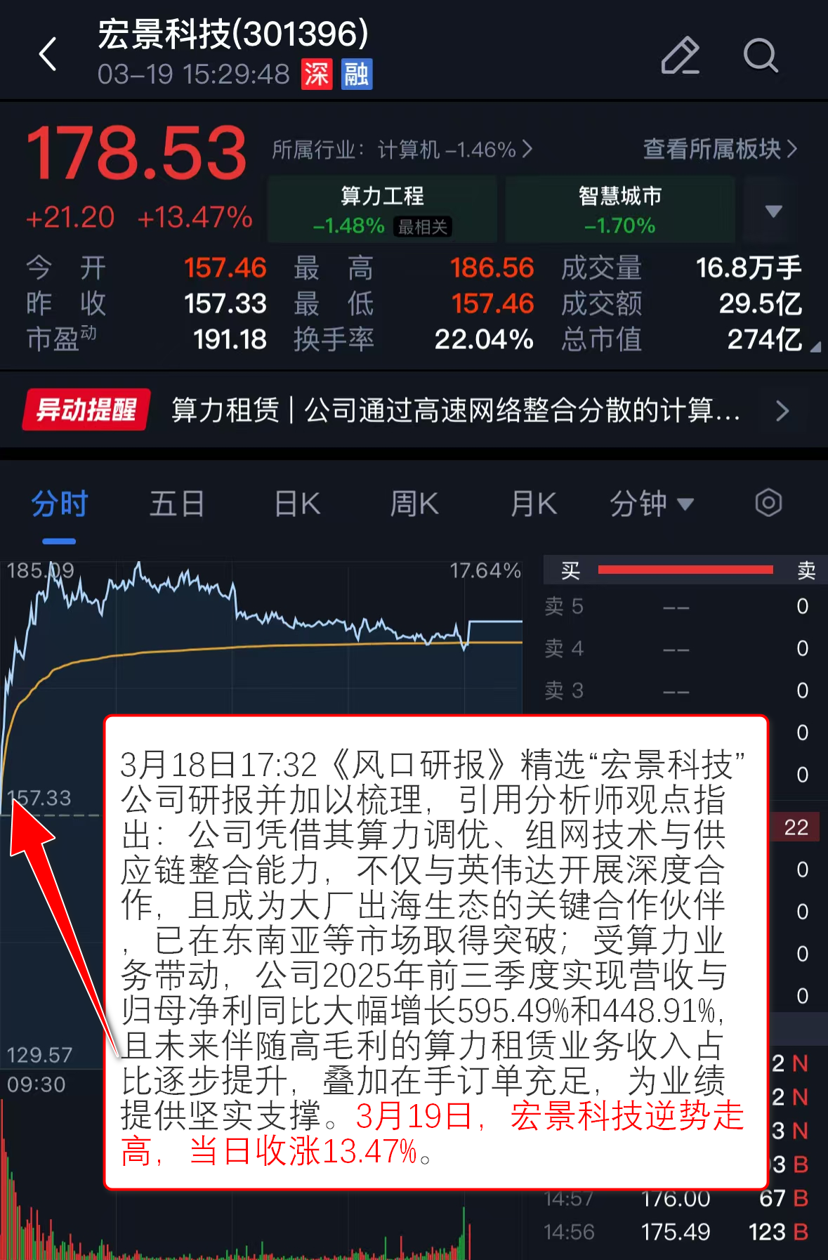 3月18日17:32《风口研报》精选“宏景科技”公司研报并加以梳理,引用分析师观点指出:公司凭借其算力调优、组网技术与供应链整合能力,不仅与英伟达开展深度合作,且成为大厂出海生态的关键合作伙伴,已在东南亚等市场取得突破;受算力业务带动,公司2025年前三季度实现营收与归母净利同比大幅增长595.49%和448.91%,且未来伴随高毛利的算力租赁业务收入占比逐步提升,叠加在手订单充足,为业绩提供坚实支撑。3月19日,宏景科技逆势走高,当日收涨13.47%。