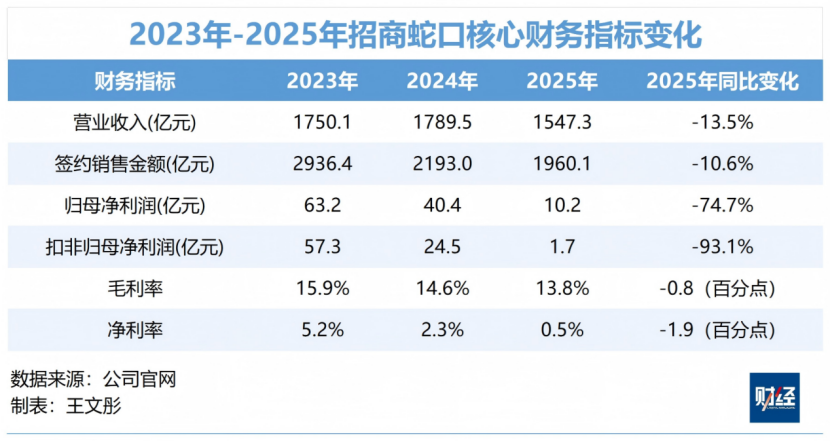 公告显示,2025年招商蛇口营收为1547.3亿元,同比下降13.5%;归母净利润为10.2亿元,同比下滑74.7%;扣非归母净利润为1.7亿元,同比下滑93.1%;净利率为0.5%,同比下滑1.9个百分点。