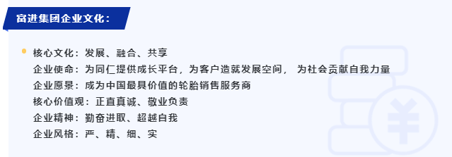 “轮越百川 富而思进”,是富进二十五年发展的精神写照!富进集团在董事长孙一平的领导下,坚守初心、匠心、恒心,紧跟市场节奏,与员工、上游厂商、优秀同行携手稳健步入合作共赢的新时代,以成为中国最具价值的轮胎销售服务商为己任、以自我革新发展不断引领中国轮胎经销商前行。