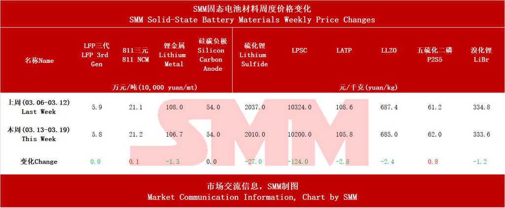前言:本周固态电池材料价格以稳中下行为主。受地缘政治等原因影响,原料硫磺和黄磷价格上行,推广涨五硫化二磷价格。