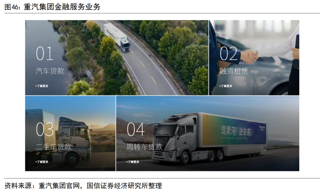 公司的金融服务业务主要有重汽汽金承担。重汽汽车金融有限公司(“重汽汽金”)成立于2015年9月18日,主要职能是向购车终端用户提供汽车贷款(含二手车)、融资租赁等金融服务,以及向经销商提供抵质押业务、库存车辆周转贷款等金融服务。重汽汽金与近千家经销商建立了合作关系,金融服务网络覆盖全国。