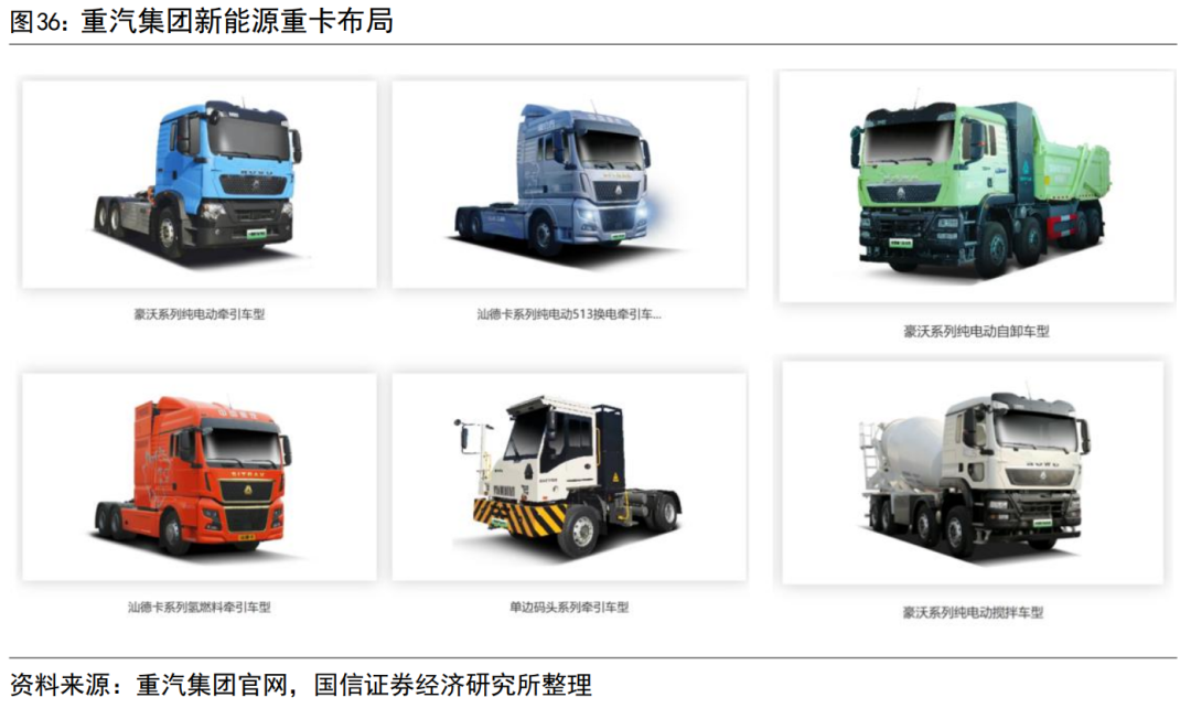 公司技术积淀深厚,重卡全品类、多能源形式布局。公司重卡产品覆盖牵引车、载货车、自卸车、搅拌车、专用车等全部细分领域;能源形式覆盖柴油、天然气、纯电、混动、燃料电池等;发动机自产或与潍柴合作,动力电池供应链包含宁德时代、弗迪、潍柴等头部企业,核心零部件做到了自主可控。