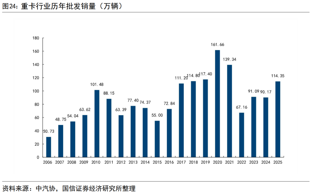 根据中汽协批发销量口径,重卡行业近20年销量呈现周期性,周期底部、顶部在抬升。重卡行业具备周期性,过去近20年中,重卡行业批发销量在2010年、2020年达到了阶段顶峰,销量分别为101.48万辆、161.66万辆;2006年、2015年、2022年处于阶段底部,销量分别为30.73万辆、55万辆、67.16万辆。由于经济的长期增长,以及出海趋势,重卡行业在周期中也具备成长性。当前处于上行周期中,2025年重卡行业批发销量超过了114万辆。