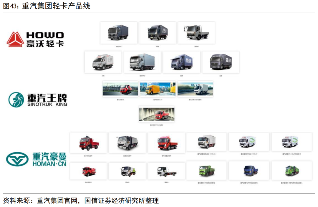 公司轻卡产品主要是豪沃、王牌、豪曼三大品牌,产品布局已经日趋完善。豪沃轻卡主要包含悍将、统帅两大产品系列,深度覆盖冷链、绿通、快递快运等多个运输场景,其中悍将系列主打高性价比,统帅系列产品整合欧洲卡车技术打造轻卡产品线。重汽王牌是重汽集团成都商用车公司为工程建设、物流运输打造的中高端轻卡品牌,拥有V1、V2、V3三大产品系列,涵盖自卸车、载货车、纯电动、氢燃料、混合动力以及各类专用车。豪曼品牌创立于2010年,产品覆盖载货车、自卸车、专用车、新能源等多个种类,具有高可靠性,高经济性、高舒适性、高安全性、高智能性等特点。伴随重汽集团全球化发展,公司的轻卡产品同样乘上了出海趋势,公司轻卡销往中国及全球110多个国家,形成公司新的增长极。