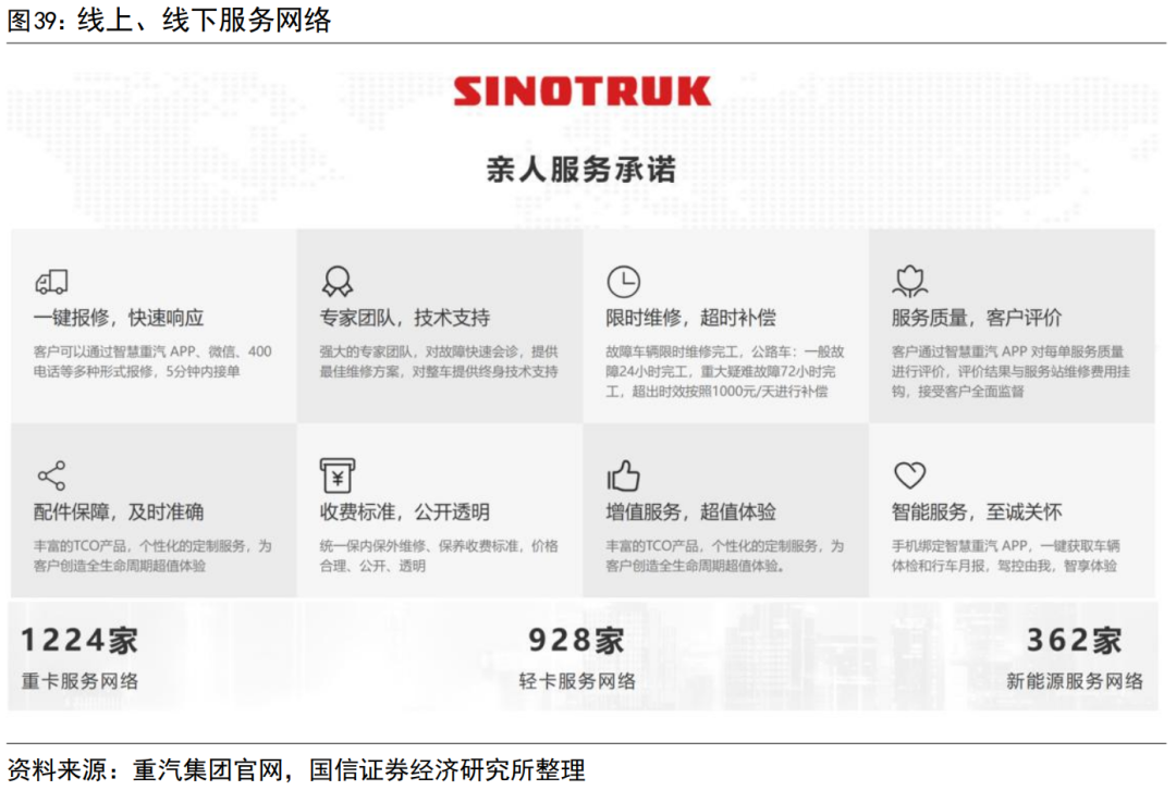重卡使用强度大,对维修服务需求较高,公司具备完善的线上、线下服务体系。公司全国布局线下重卡服务网络超1200家、轻卡服务网络900余家、新能源服务网络超360家。线上运营“智慧重汽APP”、微信服务、电话服务等,可以实现快速报修,同时储备强大的专家团队,可以线上会诊、提供维修解决方案。