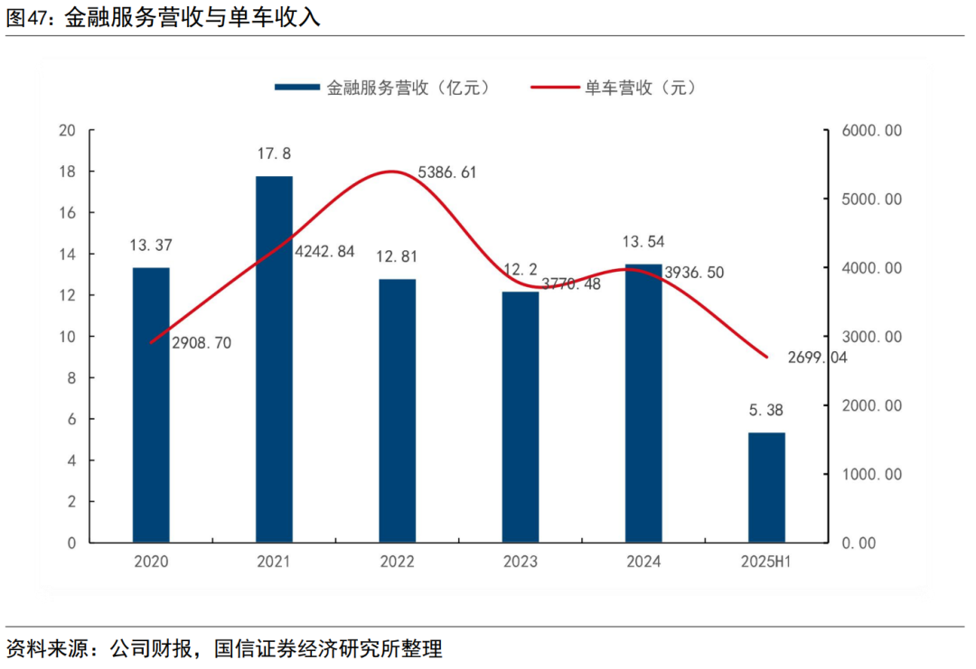 金融服务业务收入和总销量与市场环境有相关性,2025年上半年平均单车收入有所下滑。公司产品销量、金融政策、利率环境都会影响金融服务业务收入,2021年,公司金融服务业务达到近年来高点17.8亿元,2025年上半年,金融服务业务收入为5.38亿元。金融服务单车收入有所下滑,2025年上半年为2699.04元。