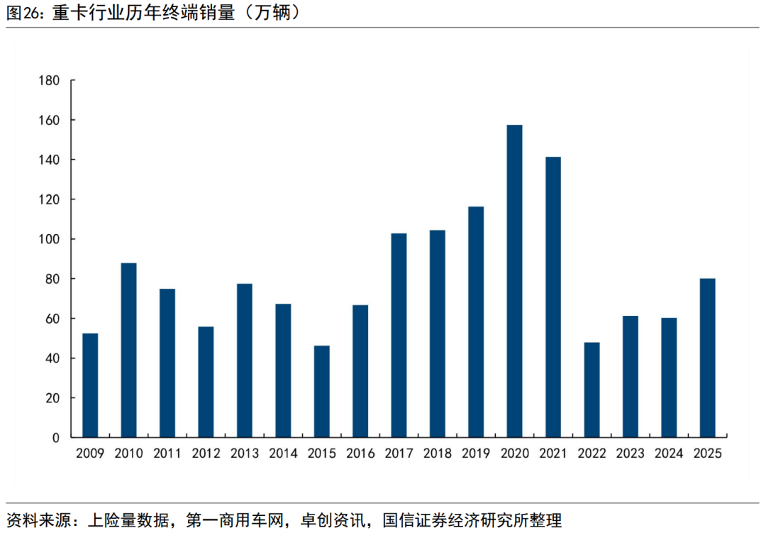 参考重卡交强险数据,重卡的内需销量的周期性更加直观。过去两轮周期的高点为2010年的87.83万辆和2020年的157.31万辆,2025年重卡终端销量复苏,约为80万辆。