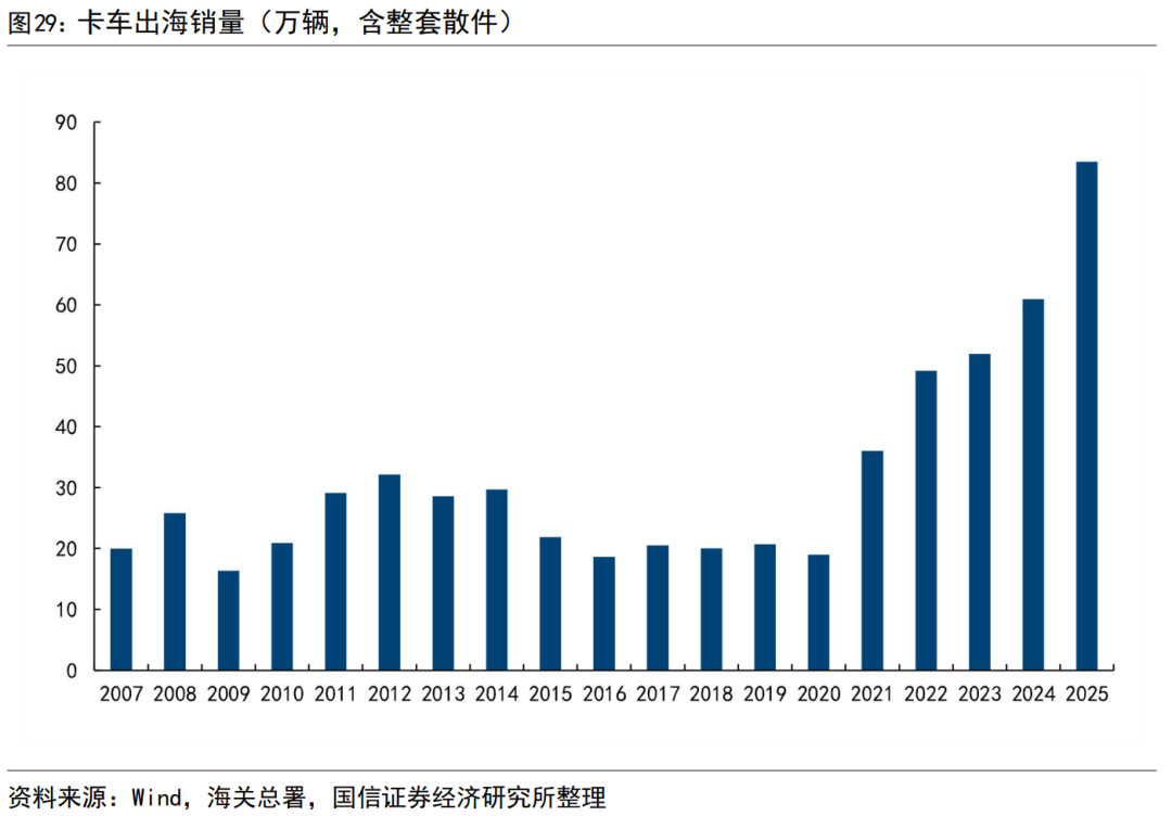 根据海关总署数据,包括重卡在内的卡车出口近年蓬勃发展。卡车行业整体的出口数据在2021年起,快速增长。2025年卡车出口83.47万辆,同比增长36.99%。