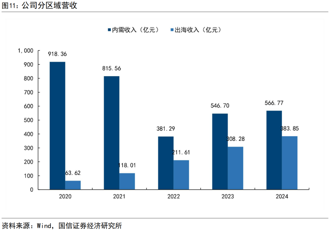 按区域拆分,海外营收已经接近国内。海外营收持续增长,2024年公司海外营收383.85亿元;国内营收在2022年触底复苏,2024年达到了566.77亿元。国内外营收差值正在持续收窄。