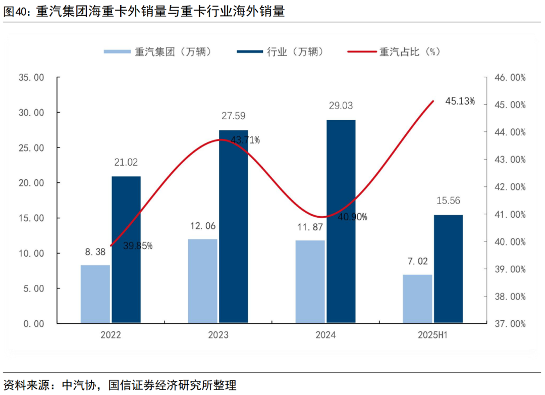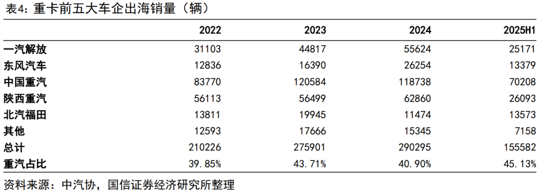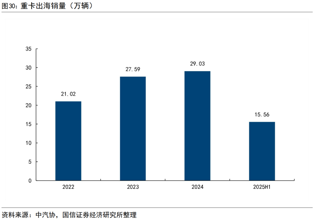 重卡行业出海同样处于增长趋势中。重卡行业2022年出口21万辆,2024年增长到29万辆以上,2025上半年出海15.56万辆,全年出海超32万辆。