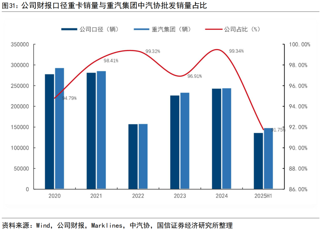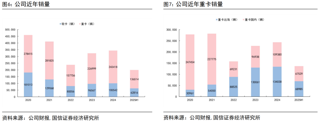 财报口径下,公司总销量重回增长趋势,重卡海外销量占比过半。根据公司财报披露口径,公司产品销量在2022年后维持增长态势。2024年重卡销量24.34万辆,轻卡销量10.05万辆,2025H1重卡销量13.65万辆,轻卡6.28万辆。重卡海外销量持续提升,又2020年的3.10万辆,增长至2024年13.40万辆。2025年上半年,公司重卡出海6.90万辆,2025年末,重汽集团官宣年内出海已突破15万辆。