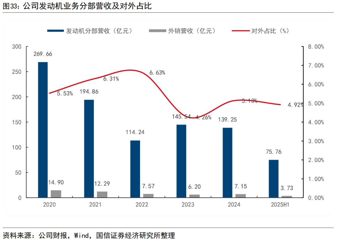 公司发动机优势显著,发动机业务和重卡业务高度联动,发动机分部当前实际年收入在150亿量级,大多数自用,少量外销。公司自产发动机优势显著,发动机分部收入在2020年高点达到了269.66亿元,2025年上半年为75.76亿元。发动机业务实际收入大多数以关联交易形式并入卡车业务,少部分外销,近年外销收入占发动机实际收入5%左右。
