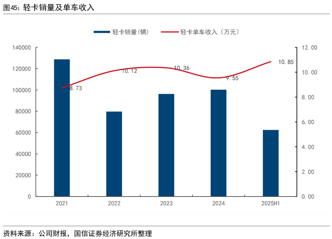 公司轻卡单车营收在2025年上升。公司轻卡的单车收入在2022-2023年上升,但是在2024年有所下降,为9.55万元;2025年上半年,公司轻卡单车收入达到了10.85万元,同比上涨13.6%。随着轻卡业务同步出海,预计未来轻卡单车收入进一步提升。