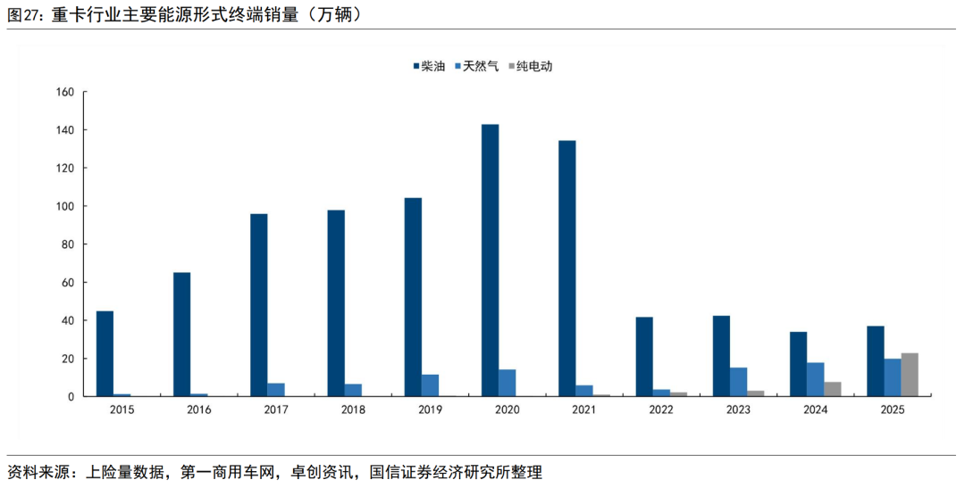 国内重卡主要能源形式为柴油、天然气、纯电,目前三者销量已经接近。过去柴油是重卡的主流能源形式;燃气重卡内需销量在2022年经历低谷后,在2023年大幅增长至15万辆以上,后续连续稳步增长至2025年的近20万辆。纯电重卡在2024/2025年连续高速增长,2023-2025年销量分别为3.0/7.7/22.8万辆。柴油重卡目前仍是国内销量最高的品类,,2025年销量约37万辆。