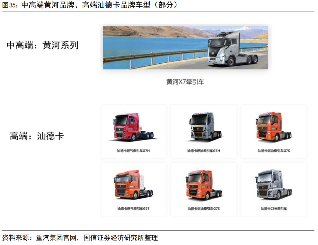 黄河品牌定位中高端,汕德卡定位高端。汕德卡(英文名SITRAK)是2009年重汽集团与德国曼恩公司联合创造的高端重卡品牌,在我国及全球50多个国家和地区均有销售;旗下包含C和G两个系列产品,涵盖了牵引车、载货车、工程车以及各类专用车。黄河品牌是重汽集团旗下中高端自主品牌,沿用了我国第一款重卡车型“黄河牌JN150”的名称,旗下最新车型黄河X7具备高智能化。