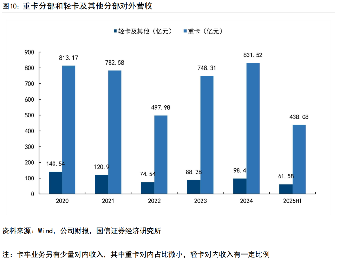 卡车等整车业务营收中,重卡占主导地位。2025年H1轻卡分部对外营收61.58亿元,重卡对外营收438.08亿元,由于销量、客单价等因素,重卡在营收中占了主导地位,近年来重卡分部营收在总收入中占比在87%左右。