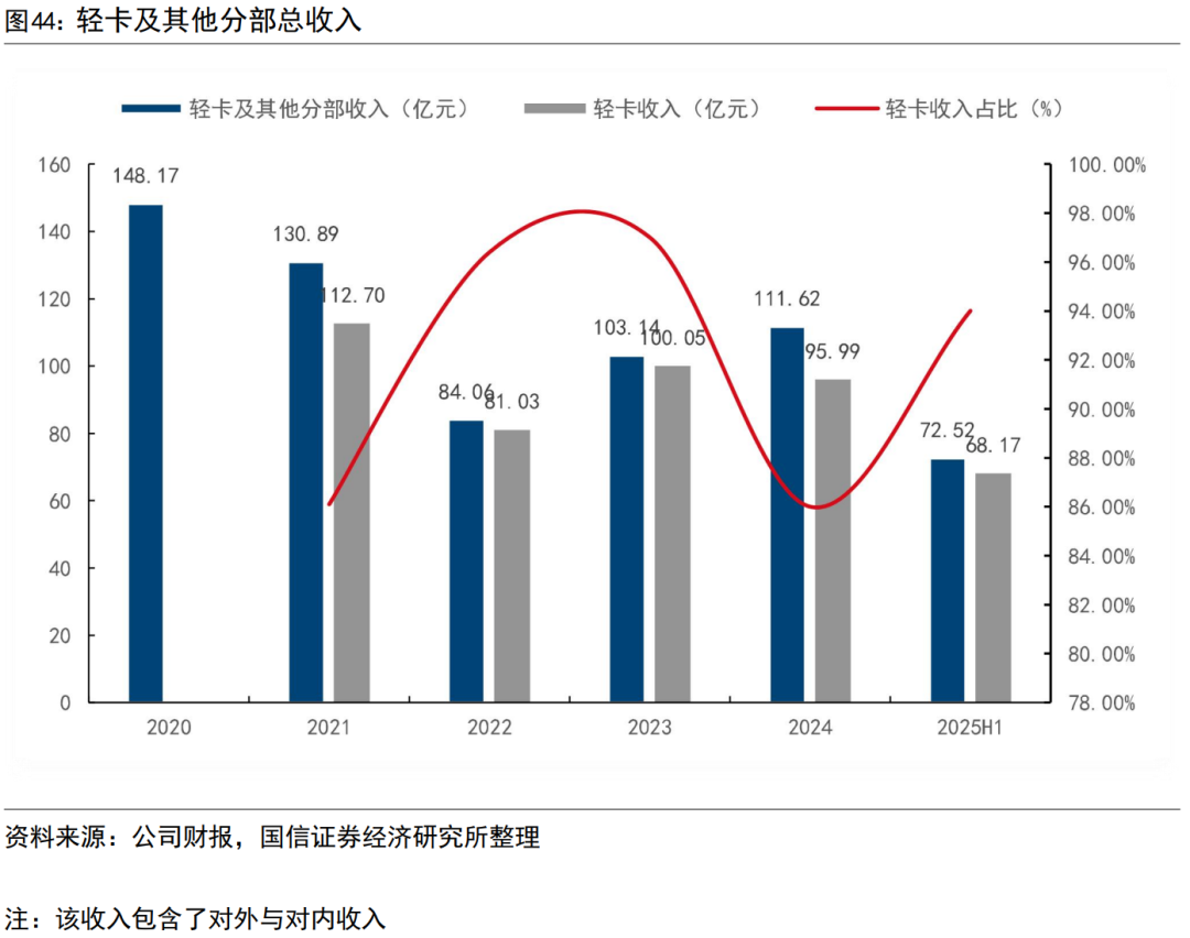轻卡业务跟随重卡处于复苏趋势中,轻卡收入预计在2025年进一步增长。公司财报披露的轻卡及其他分部中,轻卡贡献了绝大多数收入,近年轻卡收入在非重卡整车收入中占比在86-97%。2023-2024年,公司轻卡收入在100亿左右,2025年上半年轻卡收入达到了68.17亿元,预计2025全年轻卡收入迈上新台阶。
