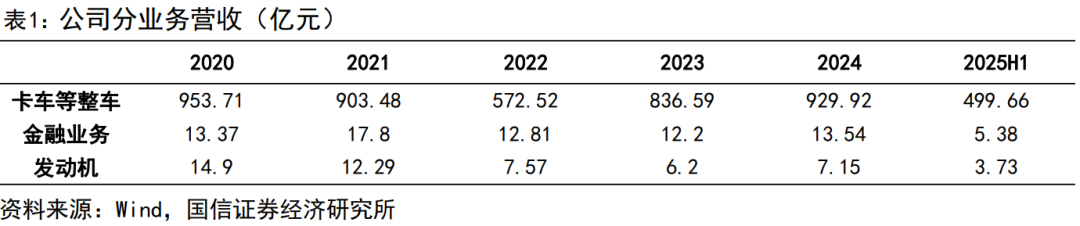 按产品拆分,公司营收以卡车产品为核心。公司2025年上半年卡车收入499.66亿元,金融业务收入5.38亿元,发动机外销收入3.73亿元。近年来,卡车业务占营收比重维持在98%左右。