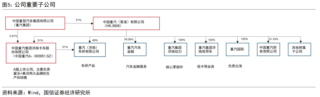 公司旗下重要分支包括中国重汽A、重汽国际、重汽金融、重汽济南商用车等。中国重汽集团济南卡车股份有限公司(中国重汽A,代码000951.SZ)是公司旗下重要子公司,公司持有中国重汽A的51%股权,中国重汽A主要负责黄河、豪沃两大重卡品牌的生产与销售。其他重要子公司还包括:重汽车桥,负责车桥产品,由公司与中国重汽A联合控股;重汽金融,负责汽车金融业务;重汽济南动力,涉及发动机等核心零部件;重汽济南商用车,负责公司轻卡分部;重汽国际,负责公司出海业务。