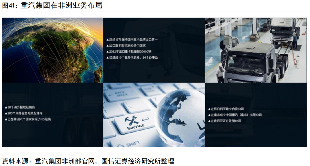非洲是公司出海的优势区域,公司在当地有良好的品牌效应和销售服务网络。重汽集团在非洲的发展可以追溯到20世纪70年代,当时早期“黄河牌”重卡服务于坦赞铁路;2010年后,重汽集团在非洲业务开始进一步发展;近年,随着非洲基建、矿业的发展,以及公司产品对欧美品牌的替代,公司重卡在非洲销量持续提升。目前,重汽集团已出口到非洲54个国家300000余辆重卡,是非洲重型卡车市场的第一大中国品牌。当前,公司在非洲的年销量和服务网点数量,在世界重卡品牌范围内,都具备领先地位。