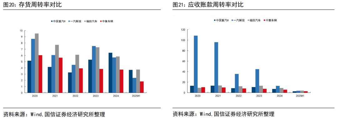 公司毛利率小幅下滑,净利润率显著提升。毛利率方面,新能源卡车占比提升,新能源产品的盈利能力仍未达到传统能源水准,毛利率收到一定影响,但整体下滑幅度有限,2025H1毛利率为15.06%。净利润率方面,由于出口比例提升,海外产品盈利能力强,净利润率在2022年后提升明显,从2022年的3.03%提升至2025H1的6.78%。