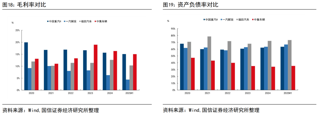 与重卡整车车企对比,公司的毛利率、资产负债率处于较好水准。与重卡五大车企的一汽解放、福田汽车相比,公司毛利率较高、资产负债率较低,盈利能力和资产结构都处于较好水平。
