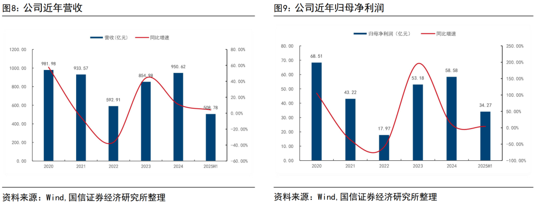 公司营收、利润均处于增长态势。2024年公司营收950.62亿元,同比增长11.19%,归母净利润58.58亿元,同比增长10.16%.2025年上半年,公司营收508.78亿元,同比增长4.21%,归母净利润34.27亿元,同比增长4.03%。