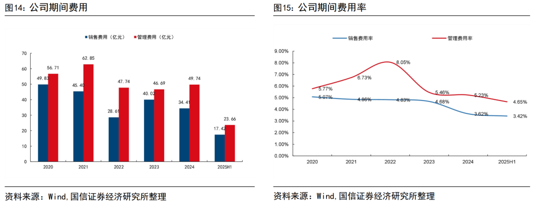 期间费用率稳步下降。公司期间费用率稳步下降,体现了良好的运营管理能力。管理费用率在2022年由于营收基数低,达到了近年高点8.05%,2025H1降至4.65%。销售费用则持续下降,从2020年的5.07%降到了2025H1的3.42%。