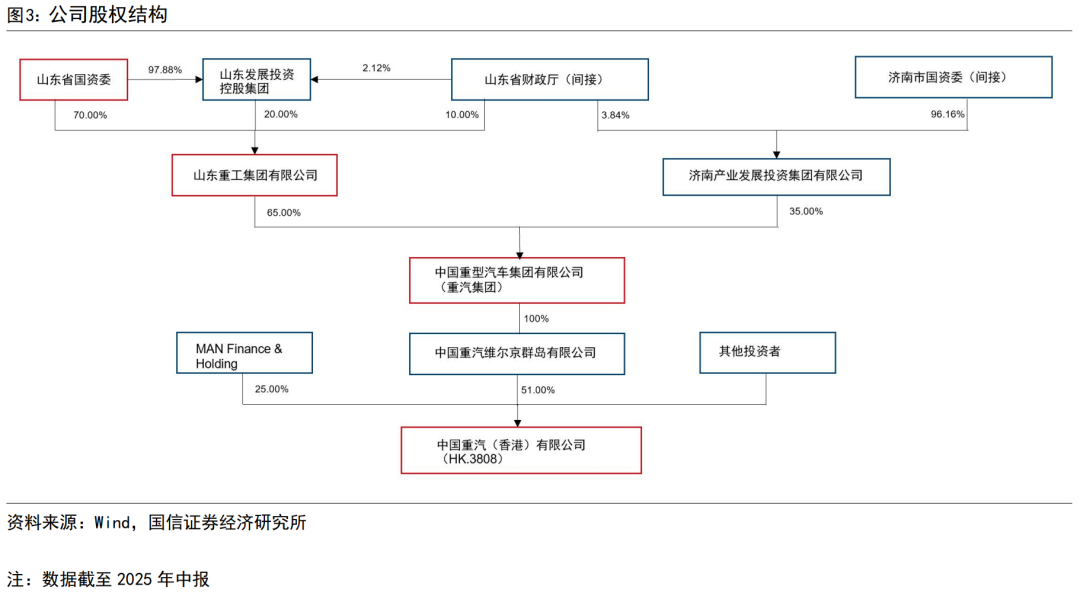 中国重汽(香港)有限公司(03808.HK,本文以“公司”代指)是重汽集团的核心上市实体,背靠山东重工。公司是重汽集团的核心上市实体,其中51%的股权由重汽集团通过旗下维尔京群岛公司控股,此外公司的重要股东还包括德国曼公司;公司的实际控制人为山东重工集团,山东重工集团和济南产业发展投资分别持有重汽集团股份的65%和35%;山东重工集团的股东为山东省国资委和省财政厅,济南产业发展的实际股东为济南市国资委和山东省财政厅。中国重汽H以外,重汽集团旗下上市公司还有中国重汽A、中通客车。