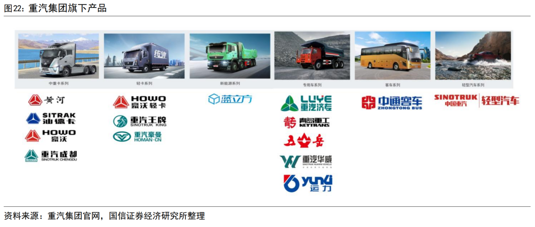 重汽集团产品布局广泛,公司承载了重汽集团重卡、轻卡核心产品及其产业链。重汽集团旗下产品包括轻中重卡、客车、发动机、车桥等,以及矿卡等特种车辆。公司所覆盖的产品主要为豪沃、汕德卡、黄河等重卡产品,豪沃轻卡、豪曼、王牌等轻卡产品,覆盖业务领域包含了整车与核心零部件的生产、海内外销售、金融服务、后市场服务等。