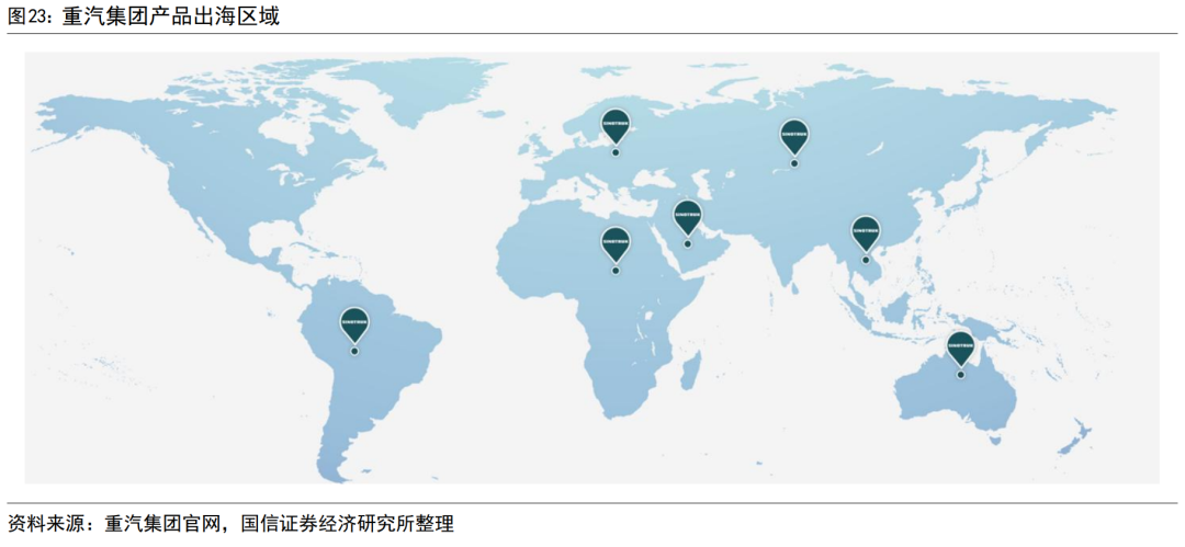 公司出海业务布局早,销售服务网络完善。公司销售服务网络已经覆盖了独联体、澳洲、东南亚、中东、南亚、非洲、美洲、欧洲等区域,产品销售至100多个国家。非洲、东南亚等地区采掘、基建、物流等需求增长,当地过往销售的重卡一定比例来自于欧美厂商的二手产品,公司产品在性能、经济性上都有优势。同时,得益于公司在对外合作过程中,积累的发动机技术积淀和全球认可度,公司产品在澳新、中东等地区也有较大市场,并且正在进军欧洲市场,公司在海外发达地区销售的产品包含汕德卡高端品牌,客单价和潜在利润较高。