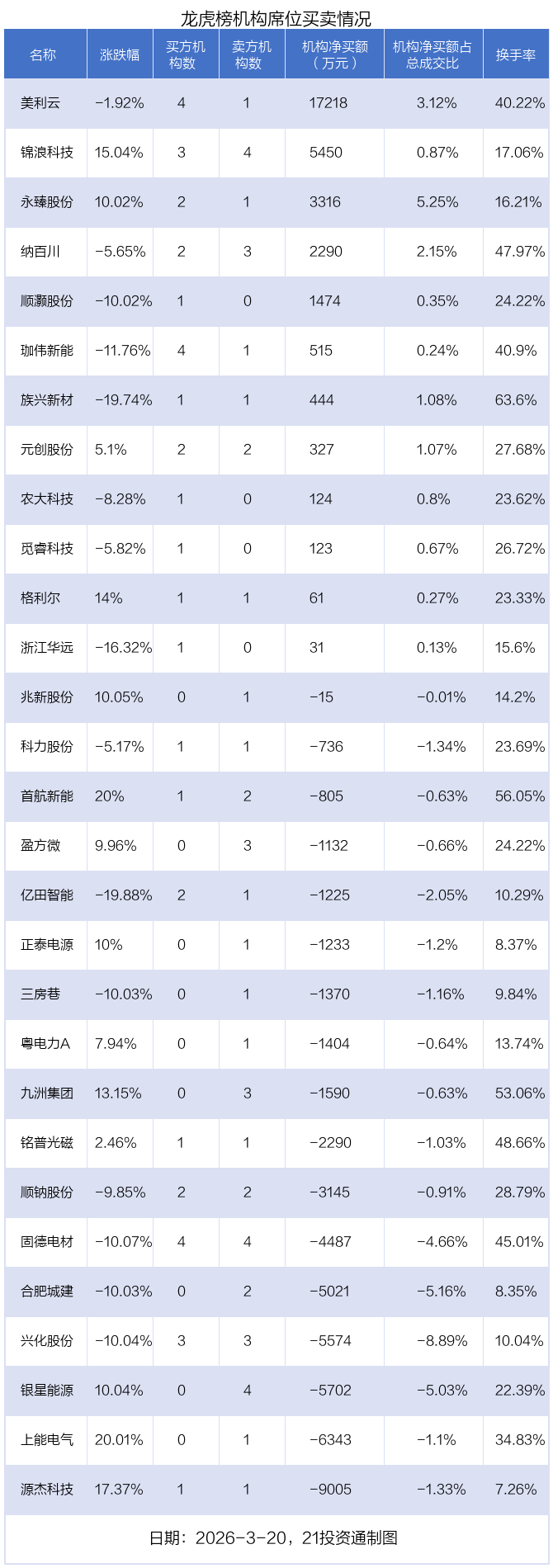 其中,机构净买入金额最多的是美利云(000815.SZ),当日收盘下跌1.92%,换手率为40.22%。