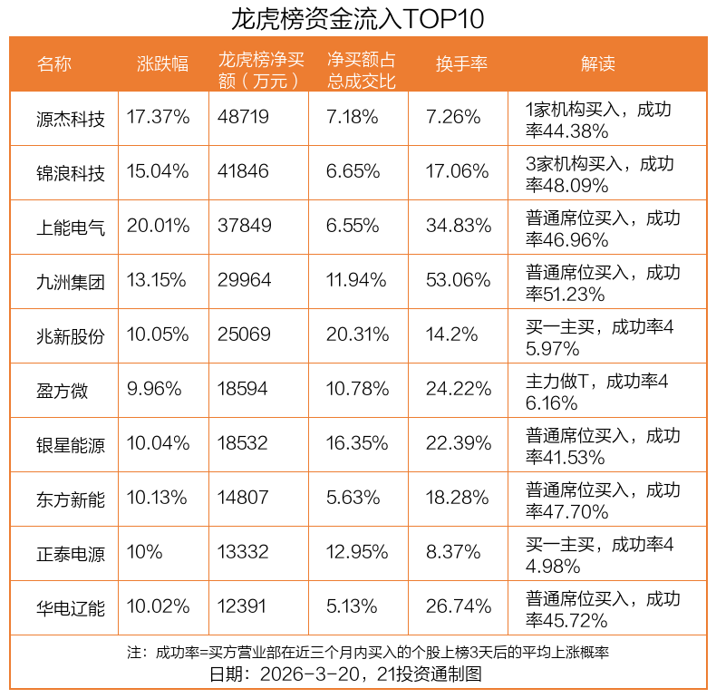 3月20日,上证指数下跌1.24%,深证成指下跌0.25%,创业板指上涨1.3%。盘后龙虎榜数据显示,共有48只个股因当日异动登上龙虎榜,资金净流入最多的是源杰科技(688498.SH),达4.87亿元。