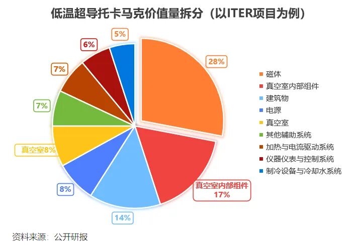 真空层需要提供近乎无杂质的环境,给聚变反应创造出空间。真空层还是聚变反应的第一道安全屏障,对材料和技术都有很高的要求。ITER项目中,真空室及内部组件在低温超导托卡马克中价值量占比约四分之一。