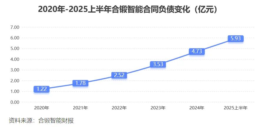 庞大市场规模下,合锻智能在手订单充沛,合同负债相应也水涨船高,2020年公司合同负债仅1.22亿,2025上半年末已经达到5.93亿元。