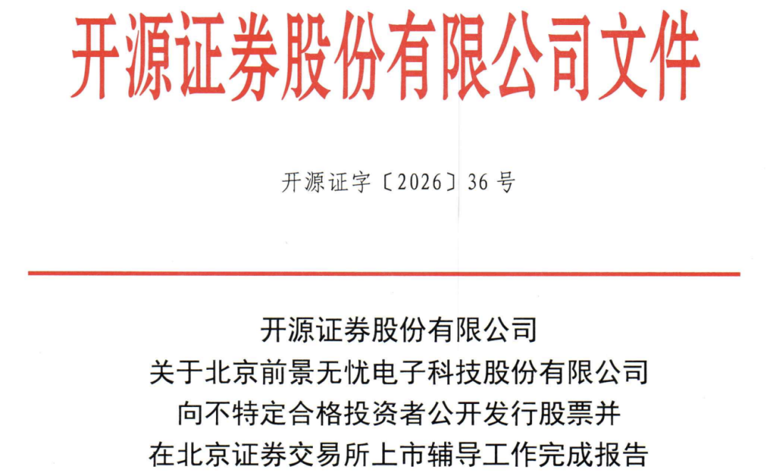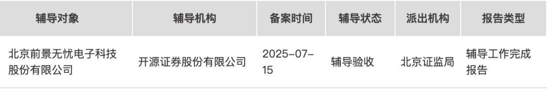 最新证监会官网显示,北京前景无忧电子科技股份有限公司辅导状态已变更为“辅导验收”。