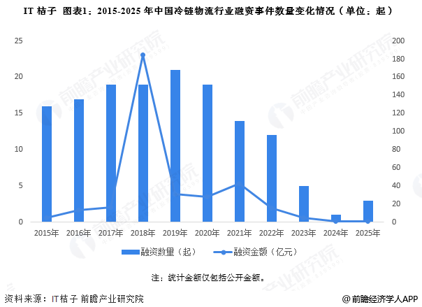 根据IT桔子库数据,2018年我国冷链物流行业融资达到顶峰,融资金额高达185亿元。之后我国冷链物流行业融资热度开始下降,国内冷链物流行业投融资市场趋于平稳,2025年中国冷链物流行业融资事件数量仅3件,已披露的融资金额为1亿元左右。