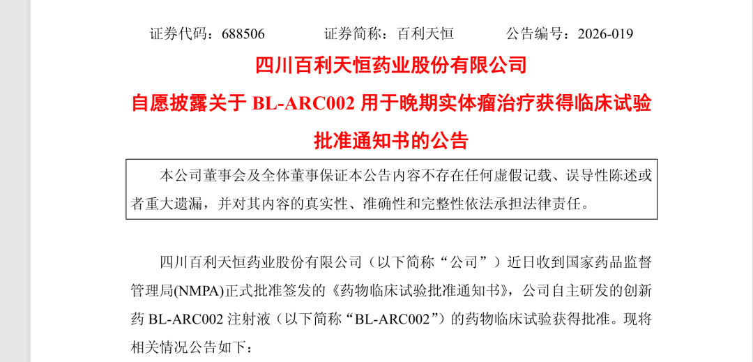3月23日,四川百利天恒药业股份有限公司宣布收到国家药品监督管理局(NMPA)正式批准签发的《药物临床试验批准通知书》,其抗体放射性核素偶联物(ARC)BL-ARC002注射液(BL-ARC002)获批晚期实体瘤临床试验。