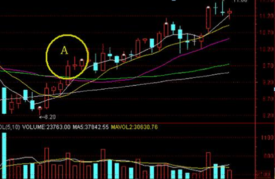 上图为K线图,按照“重上五线金不换”的原则,A点处是买入点,这是不会错的。收盘价能买吗?当然能买,因为五天前它的K线不是五线之上,最近四天才能说是五线之上,所以最近四天都是买入机会,就这么简单。