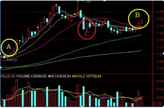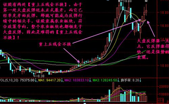 重上五线金不换。图中的A点处是日K线重新回到五线之上(5、10、20、60、120日价格平均线),这是买入机会。股价到了C点处,就不是在五线之上了,应该叫做(5、10、20日均线)三线之下,这里不但不能买入,反而应该卖出。B点是重上五线金不换,应该买进。股票买卖就这么简单;更深的道理还有,比如下一轮涨势的领头羊是谁?通过五线之上的速度和角度分析,我们基本上能抓个八九不离十。