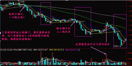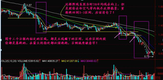 图中个股走出了一个标准的“五线顺下” 走势,五条均线顺着一个方向向下。