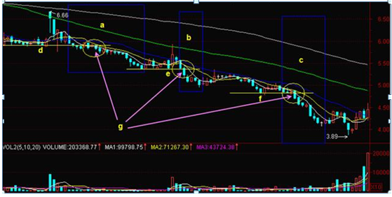 我们来看,它是不是五线向下呢?120平均线和60平均线向下已经显而易见了,5日、10日、20日均线也在向下,但好像还不是很顺。图中a框内,五线全部是向下的,b区也是五线顺下,c区也是如此。我们发现,只要是“五线顺下” 的地方,股价下跌特别快。五线不顺的时候,跌势会相对平缓一下;五线不顺的时候,股价就会形成一个个小平台(见图中d、e、f三个小平台)。每次暴跌发生在什么地方呢?每一个股票基本都是这种情况:发生在各个小平台被突破的地方,在各个圆圈的正中间开始下跌了。
