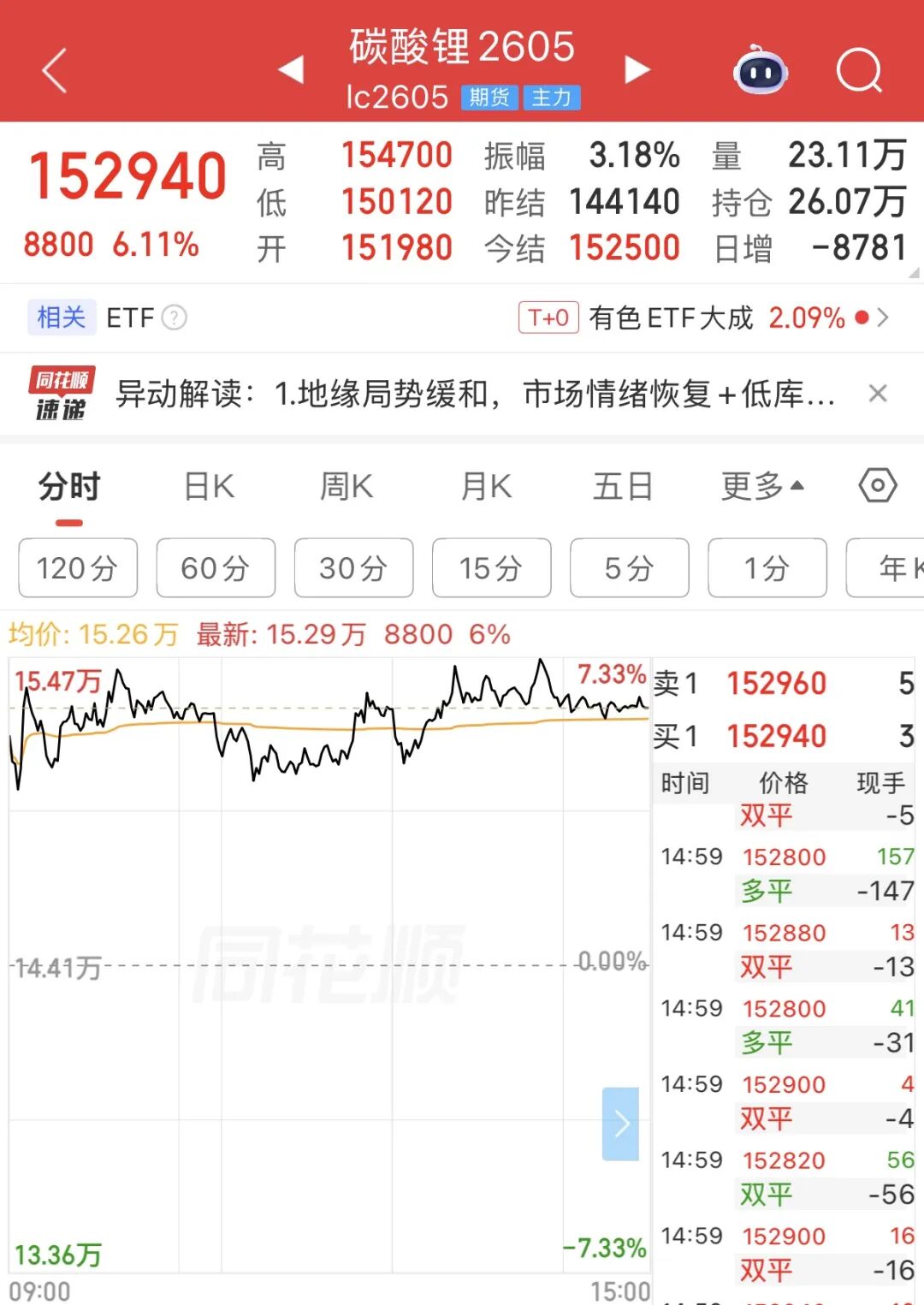 同花顺数据显示,截至收盘,碳酸锂主力合约大涨超6%,收报152940元/吨。今年以来,碳酸锂主力合约累计涨逾26%。