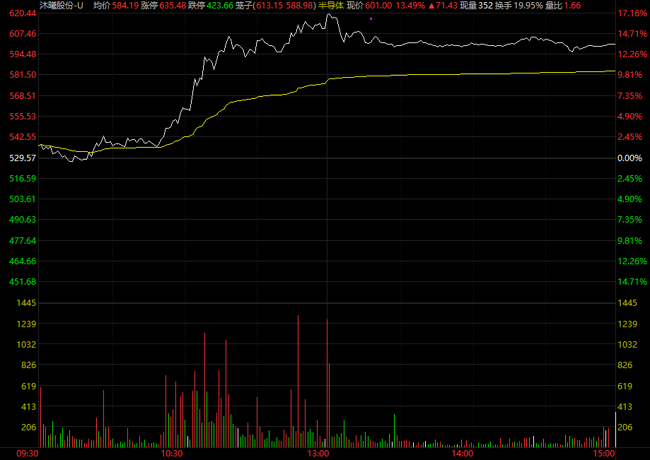 算力芯片概念持续走高,国产芯片龙头集体大涨,沐曦股份-U大涨13.49%、摩尔线程-U涨超8%、寒武纪涨近6%。