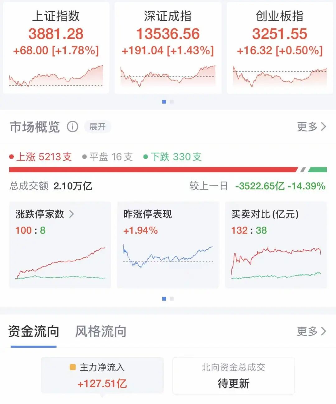 3月24日,市场全天探底回升,沪指、深成指均涨超1%,创业板指尾盘翻红,此前一度跌近2.5%。截至收盘,沪指涨1.78%,深成指涨1.43%,创业板指涨0.5%。黄白线分化明显,微盘股指数大涨超5%。沪深两市成交额2.08万亿元,较上一个交易日缩量3487亿元。全市场超5200只个股上涨,其中100只个股涨停。